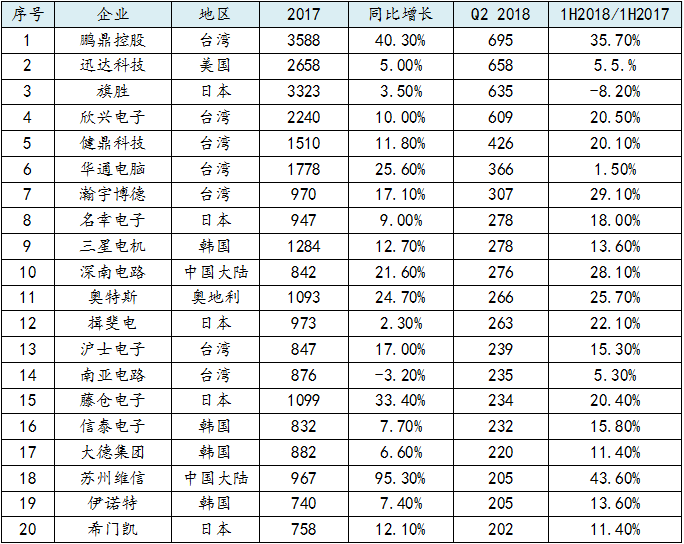 表2:2018年上半年全球PCB供应20强(单位:百万美元)