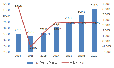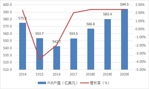 图3:2014-2020年全球PCB产值及预估
