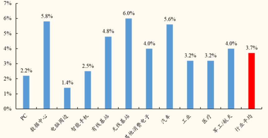 图1:18-23 年各下游应用领域 PCB 市场增速