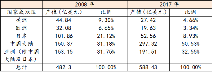 表1:2008与2017年世界PCB产值与分布对比
