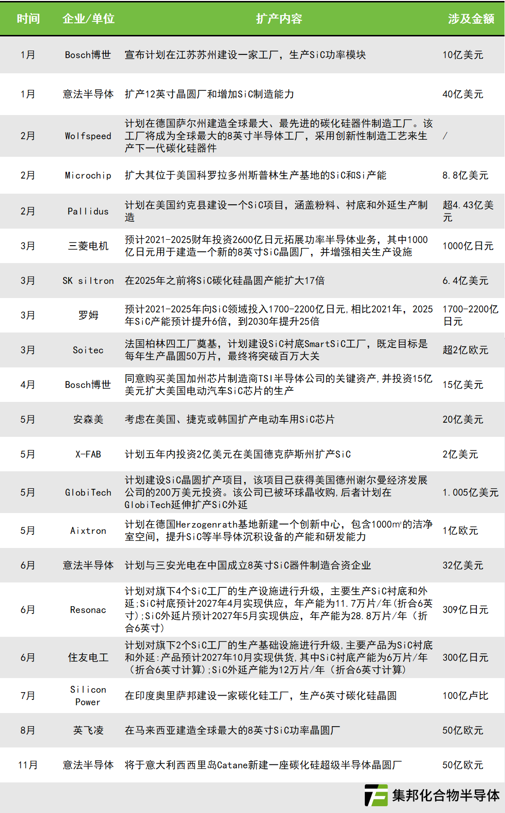 从扩产内容来看,2023年度SiC扩产主要围绕原材料、衬底、外延、器件、设备等全产业链进行。