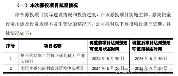 延期的原因是:受整体宏观经济波动,项目实施过程中关于建设、调试、生产等方面的不确定性,以及碳化硅行业市场环境变化等因素影响,公司对相关募集资金投资项目进度有所放缓,无法在原预定可使用状态日期前完成。