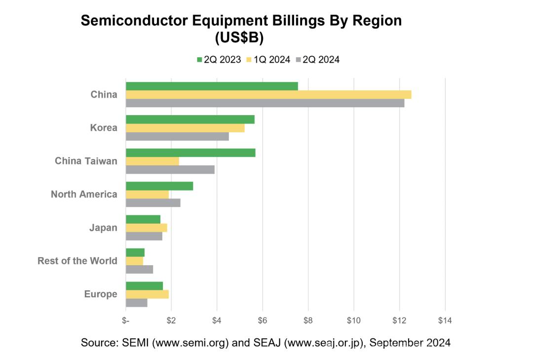 其中,中国大陆第二季度半导体设备出货总额为122.1亿美元,同比成长62%,依然是全球最重要的市场。
