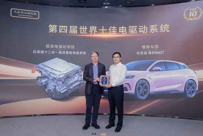 汽车评价研究院院长李庆文先生(图左)向比亚迪汽车工程研究院高压系统副总工程师、电驱动总成技术研发部经理于刚华先生(图右)颁奖