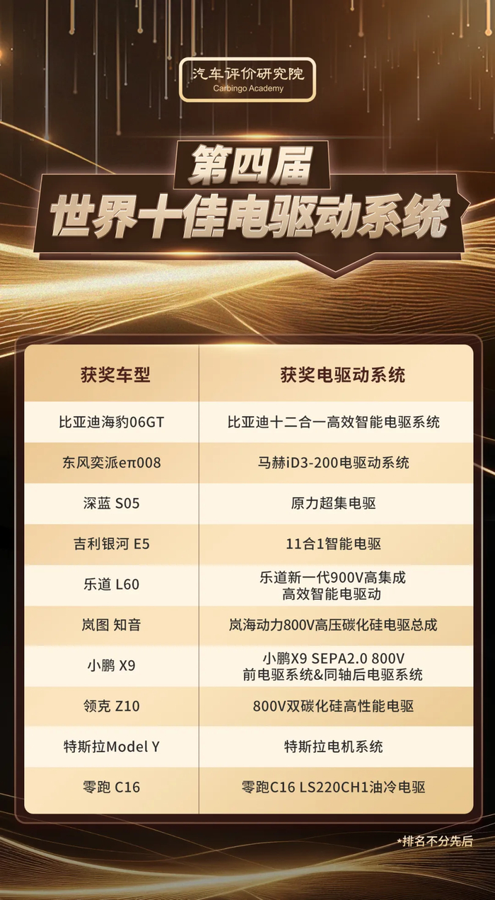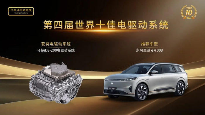 2024年12月17日,汽车评价研究院正式发布第四届世界十佳电驱动系统评价结果,评委会结合客观指标、主观评价打分,经过多轮投票讨论,最终达成一致意见(排名不分先后)。