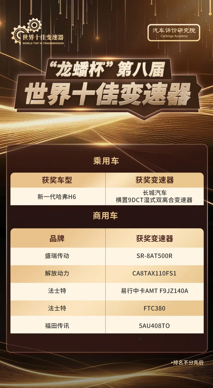 2024年12月17日,汽车评价研究院正式发布“龙蟠杯”第八届世界十佳变速器评价结果,评委会结合客观指标、主观评价打分,经过多轮投票讨论,最终达成一致意见(排名不分先后)。