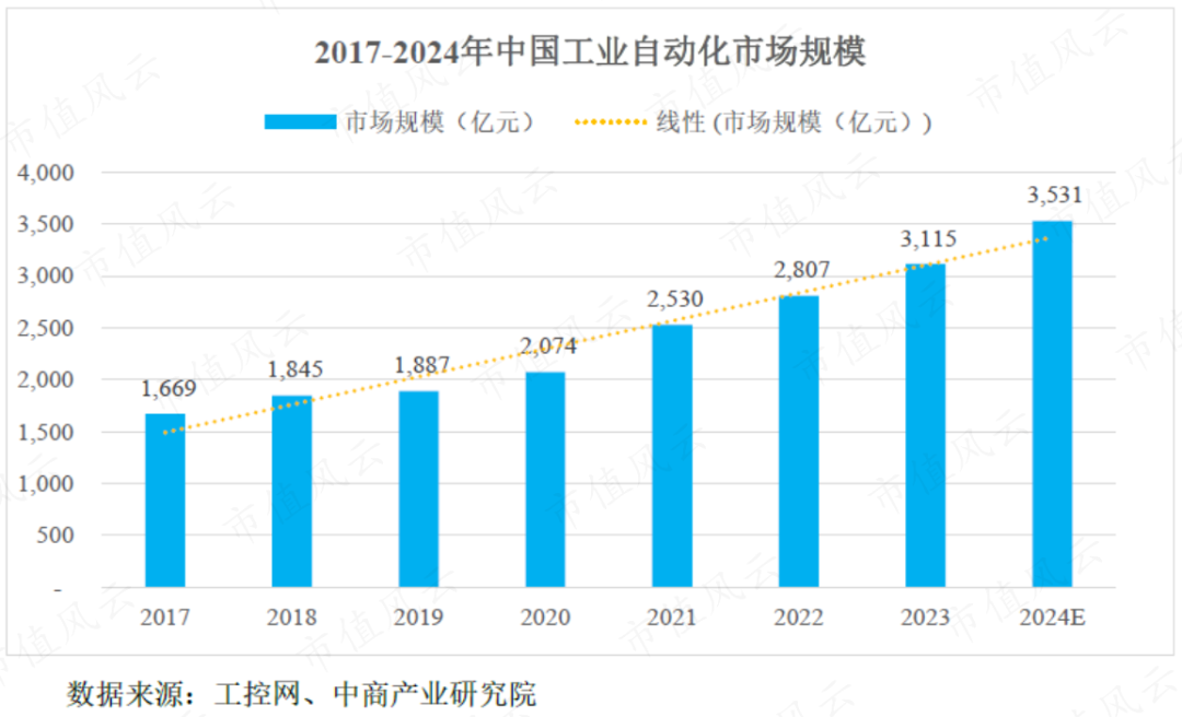 回到国内市场,根据工控网、中商产业研究院数据,2023年中国工业自动化市场规模达3,115亿元,预计2024年将增长至3,531亿元。